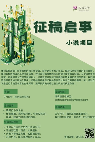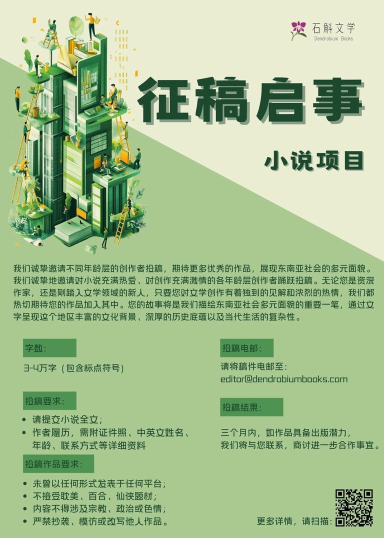 我们诚挚地邀请对小说充满热爱、对创作充满激情的各年龄层创作者踊跃投稿。无论您是资深作家,还是刚踏入文学领域的新人,只要您对文学创作有着独到的见解和浓烈的热情,我们都热切期待您的作品加入其中。您的故事将是我们描绘东南亚社会多元面貌的重要一笔,通过文字呈现这个地区丰富的文化背景、深厚的历史底蕴以及当代生活的复杂性。